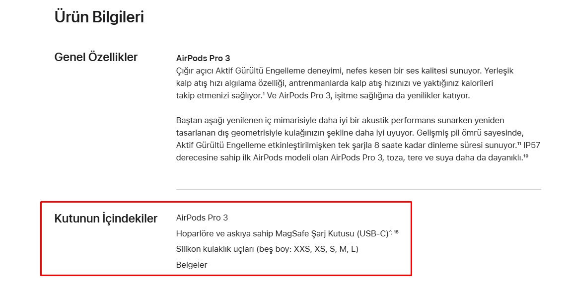 AirPods Pro 3 için hazırlanan teknik özellikler sayfası, USB-C şarj kablosunun ayrı satıldığını doğruluyor. ABD’de Apple’ın en ucuz USB-C kablosu 19 dolara satılıyor. Ancak kullanıcıların herhangi bir markanın USB-C kablosunu kullanması da mümkün.