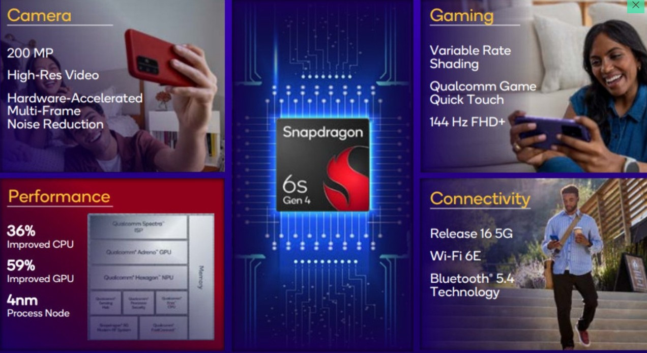 Grafik tarafında ise Adreno (muhtemelen Adreno 810) GPU’su, geçen yılki Snapdragon 6s Gen 3’e kıyasla %59 oranında performans artışı sağlıyor. Qualcomm, bu GPU’nun Full HD+ ekranlarda 144 Hz yenileme hızı sunabileceğini söylüyor; önceki çipte bu değer 120 Hz ile sınırlıydı.