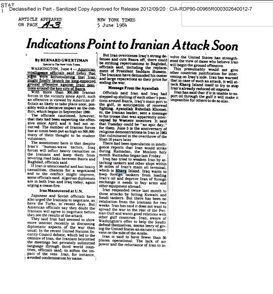 Bu stratejik veriler, ilk kez 4 Haziran 1984 tarihinde The New York Times gazetesi tarafından 'İran Saldırısının Yakın Olduğuna Dair İşaretler' başlığıyla dünya kamuoyuna duyurulmuştu.