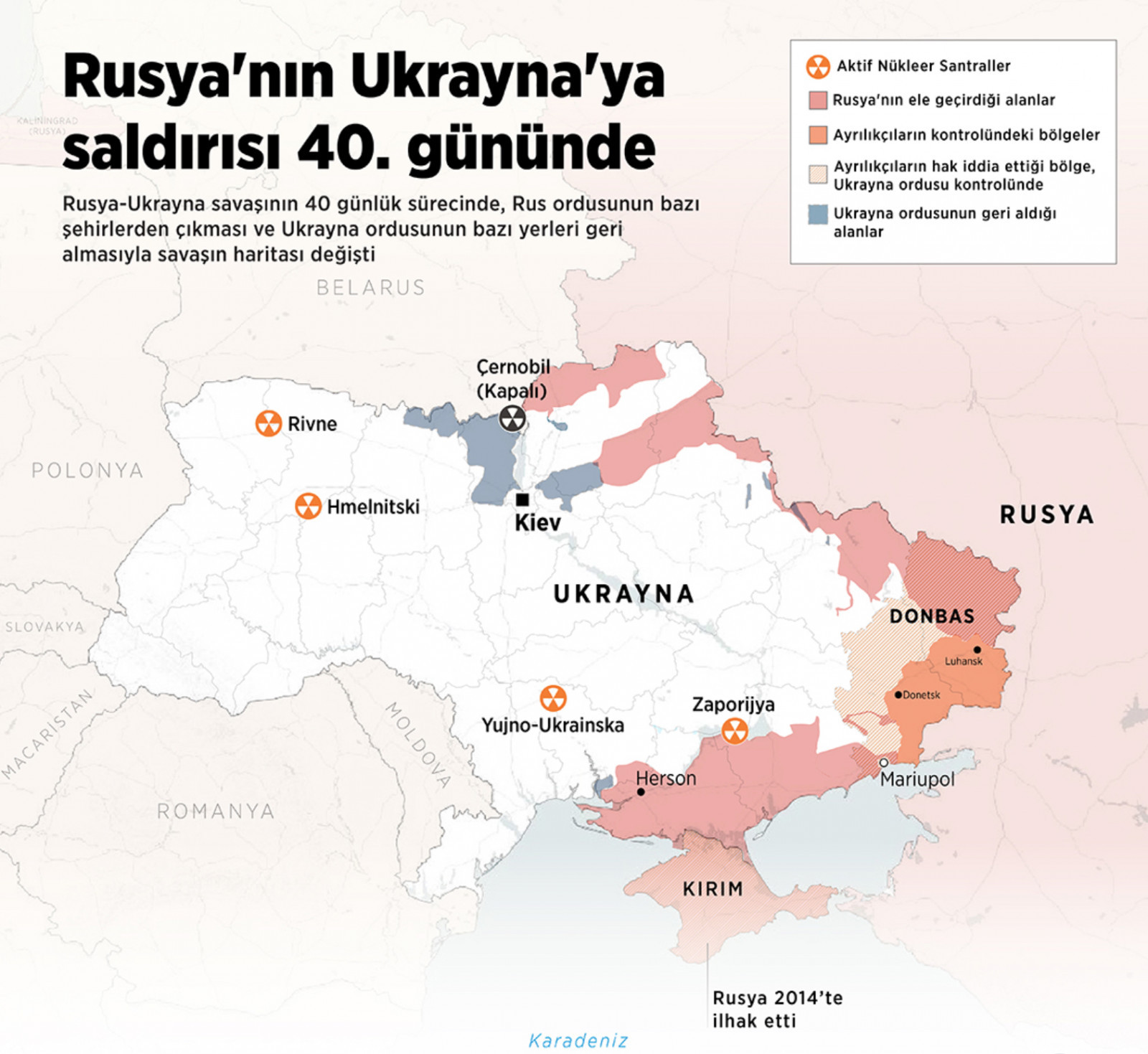 Rus ordusu, savaşın 40. gününe girerken, denizden Odessa'daki petrol depolarına füze saldırısı düzenledi. Ternopil, Mikolayiv, İvano-Frankivsk, Rivne, Harkiv, Hmelnitski bölgeleri de Rus ordusunca top ve füze saldırılarının hedefi oldu.