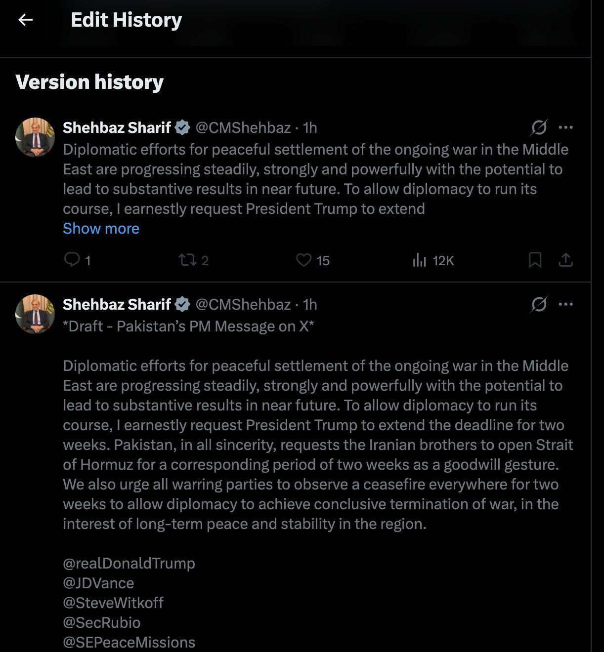 Gece geç saatlerde alınan ateşkes kararı öncesinde yürütülen müzakerelerle ilgili Pakistan Başbakanı Şahbaz Şerif'in paylaşımları tartışma yaratmıştı. Şerif'in paylaşımının başında yer alan “Taslak - Pakistan Başbakanı’nın X Mesajı” ifadesi, mesajın Donald Trump tarafından yazıldığı iddialarını gündeme taşımıştı.