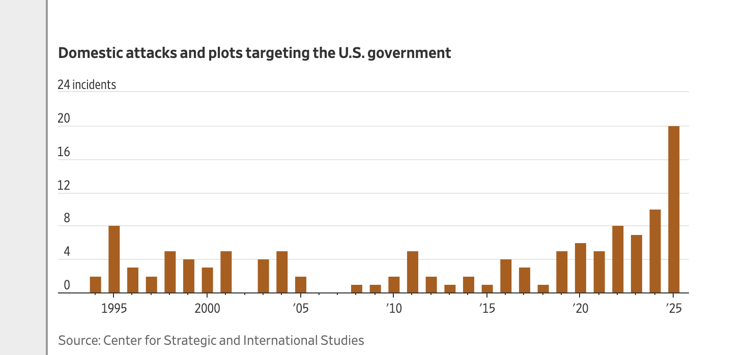 ABD’de siyasal şiddet endişesi yeniden büyüyor. Wall Street Journal’ın Uluslararası Stratejik Araştırmalar Merkezi (CSIS) verilerine dayandırdığı haberine göre, ABD hükümetini hedef alan iç saldırılar ve saldırı planları 1994’ten bu yana en yüksek seviyeye çıktı.