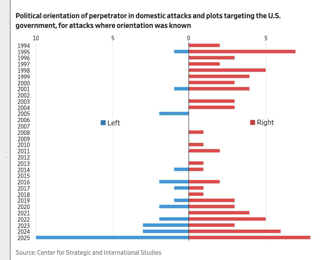 CSIS verilerine göre 2025’te ABD hükümetini hedef alan 20 saldırı ve saldırı planı kayda geçti. Bunların 10’u aşırı sol, sekizi ise aşırı sağ kaynaklı olarak sınıflandırıldı. Böylece aşırı sol kaynaklı saldırı ve planlar, 20 yılda ilk kez aşırı sağ kaynaklı olanları geride bıraktı.