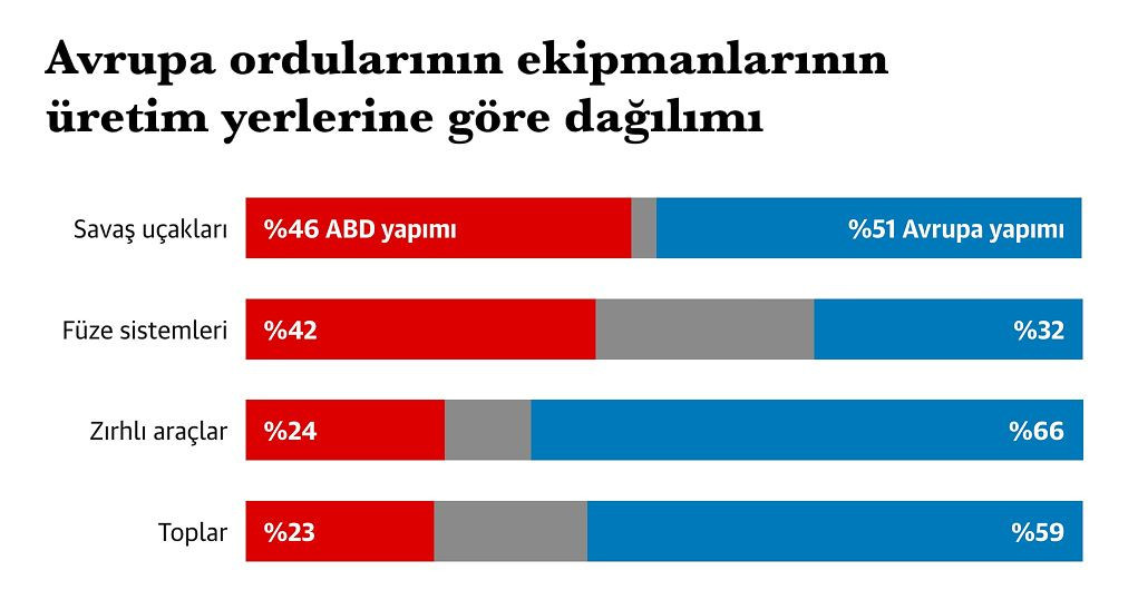 Almanya’nın, 2029 yılına kadar savunmasına yılda 153 milyar euro harcaması bekleniyor. Bu harcama, ülkenin Doğu ve Batı Almanya’nın birleşmesinden bu yana en iddialı askeri genişleme olmasının yanı sıra, gayri safi yurt içi hasılasının da yaklaşık yüzde 3,5’ine denk geliyor. Fransa’nın 2030 yılına kadar savunma bütçesine ayırdığı yaklaşık 80 milyar euroyu, Polonya gayri safi yurt içi hasılasının yüzde 4,7’sine denk gelen 44 milyar euroyla takip ediyor.