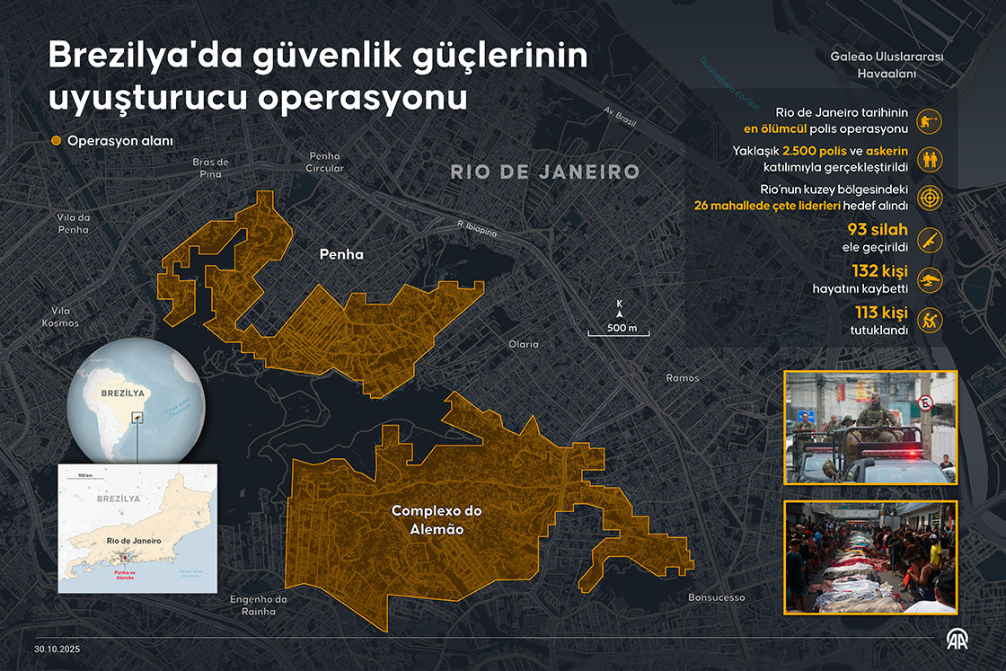 Rio de Janeiro'nun kuzeyinde yer alan, "favela" (yoksul mahalle) olarak adlandırılan Penha ve Alemao mahallelerinde ülkenin en büyük suç örgütlerinden Comando Vermelho'ya yönelik uyuşturucu operasyonu düzenlendi. Operasyonda çıkan çatışmalarda şimdiye kadar hayatını kaybedenlerin sayısı dördü polis 132 kişiye yükseldi. Penha Mahallesi sakinleri, operasyonda öldürülen 72 kişinin cesedini Sao Lucas Meydanı'nda topladı. Sosyal medyadaki paylaşımlarda bazı kişilerin cansız bedenlerin başında ağladıkları görüldü. Mahalle sakinleri, cesetlerin tahliyesi ve kimlik tespiti için yetkililere çağrıda bulundu.