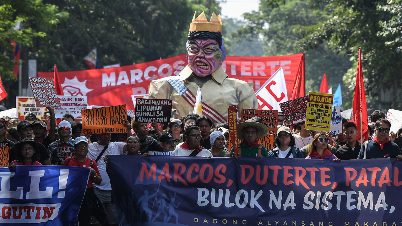 20 binden fazla kişinin katıldığı mitingde polis 12 bin memurun görevlendirildiğini belirtti. Başkanlık sarayına giden yollar dikenli teller ve konteyner kamyonetlerle kapatıldı. Protestocular, Marcos Jr ve başkan yardımcısı Sara Duterte’yi timsah olarak gösteren ve “yolsuz-timsah” diye adlandırılan maket büstler taşırken "Suç işleyenleri hapse atın!" sloganları attı.