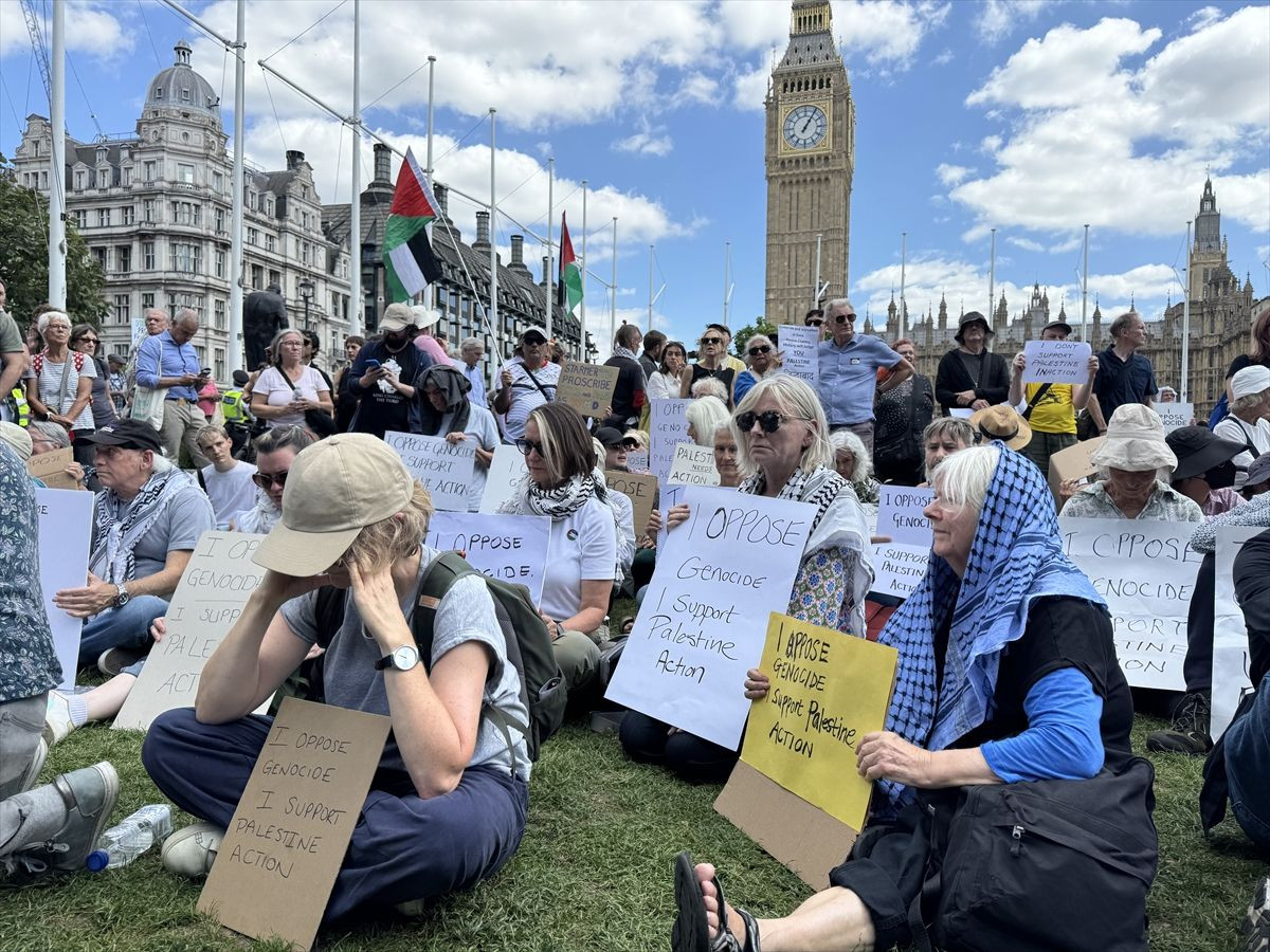 Geçen ay yasaklanan ve terör örgütü ilan edilen "Palestine Action"a destek için başkent Londra'daki Parlamento Meydanı'nda toplanan yüzlerce gösterici, yerel saatle 13.00'te eylemlerine başladı. Eylemciler, yanlarında boş pankartlar ve kalemler getirerek, pankartlarına "Soykırıma karşıyım, Palestine Action'ı destekliyorum" ifadesini yazdı.