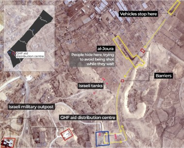 Al Jazeera, 13 Temmuz’da Refah'ın Şakuş bölgesindeki GHF yardım dağıtım merkezinin uydu görüntülerini analiz etti.