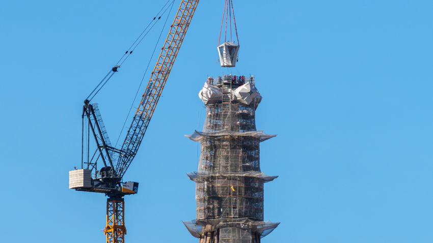 Kulenin tepesindeki haçın son parçası vinç yardımıyla yerleştirildi. İskeleler arasındaki montaj çalışmasını izlemek için çok sayıda turist bazilika çevresinde toplandı. Üst kolun yerine oturtulması sırasında işçiler emniyet halatlarıyla son rötuşları yaptı.
