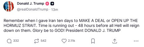 "İran'a bir anlaşma yapması veya Hürmüz Boğazı'nı açması için on gün verdiğimi hatırlıyor musunuz? Zaman daralıyor, tüm cehennemin onların üzerine yağmasına 48 saat kaldı"