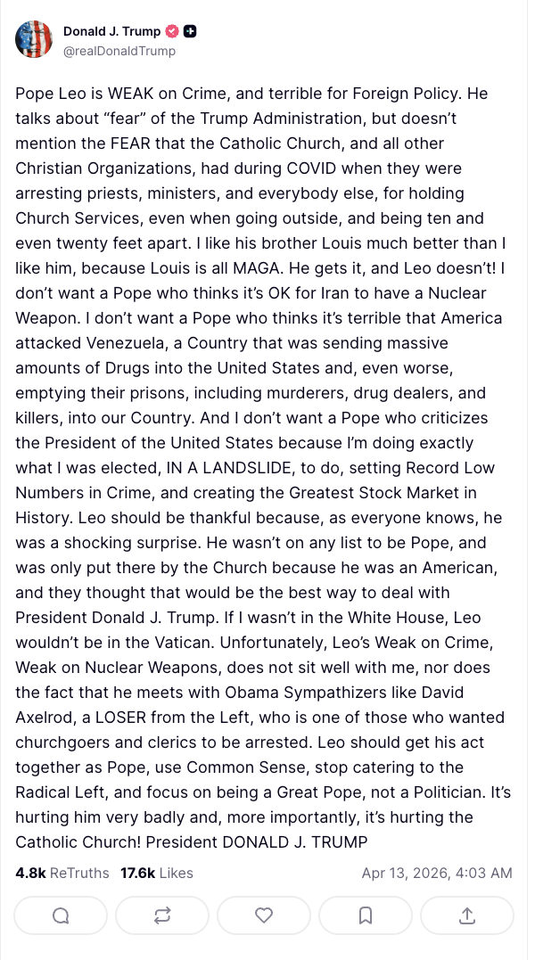 Leo bir Papa olarak kendine çekidüzen vermeli, sağduyulu olmalı, radikal sola yaranmayı bırakmalı ve bir politikacı değil, Büyük bir Papa olmaya odaklanmalı. Bu ona çok ciddi zarar veriyor ve daha da önemlisi, Katolik Kilisesi’ne zarar veriyor.”