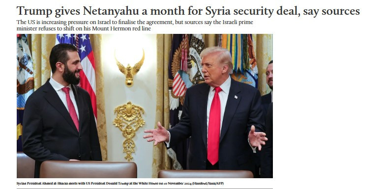 Kaynak, Trump’ın Şara’ya, İsrail Başbakanı Binyamin Netanyahu’ya anlaşmayı tamamlaması için bir ay süre verdiğini söylediğini aktardı ve şöyle dedi: