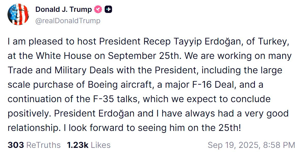 Cumhurbaşkanı Erdoğan ile her zaman iyi bir ilişkisi olduğunu ifade eden Trump, 25 Eylül’de Beyaz Saray’da yapılacak görüşmeyi sabırsızlıkla beklediğini dile getirdi. Açıklamalar, Ankara-Washington hattında hem savunma sanayii hem de ticaret alanında yeni bir işbirliği döneminin sinyali olarak değerlendiriliyor.