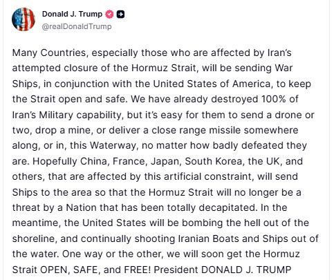 - Umarım Çin, Fransa, Japonya, Güney Kore, Birleşik Krallık ve bu yapay kısıtlamadan etkilenen diğer ülkeler bölgeye gemi gönderir, böylece Hürmüz Boğazı artık tamamen yok edilmiş bir ülke tarafından tehdit edilemez hale gelir.