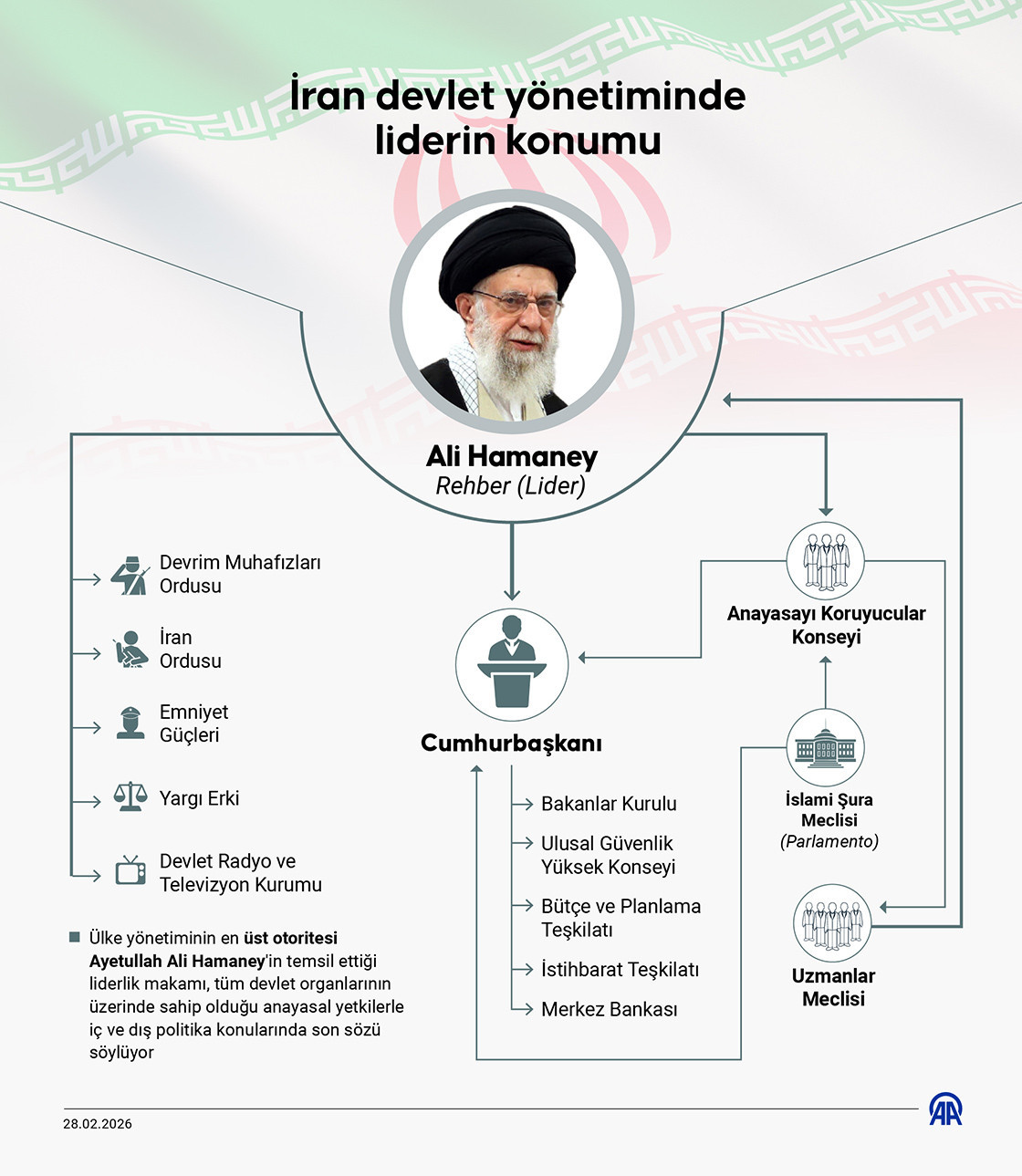 İran’ın en yüksek makamı olan dini liderlik, tüm diğer devlet organlarının üstünde yer alıyor. Hamaney, yargı başkanlarını, devlet medyasının yöneticilerini ve kilit güvenlik kurumlarının başkanlarını atama yetkisine sahipti. Ayrıca cumhurbaşkanlığına aday olabilecek kişilere de son kararı o veriyordu.