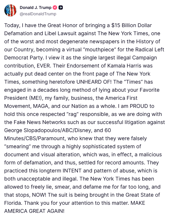 Trump, gazetenin kendisi, ailesi, şirketleri, “Amerika Önce Hareketi” (America First Movement) ve MAGA hakkında on yıllardır “yalan haberler ve karalama kampanyaları” yürüttüğünü öne sürdü. Özellikle gazetenin 2024 başkanlık seçimlerinde Kamala Harris’e verdiği desteği eleştiren Trump, bunun “duyulmamış bir yasa dışı kampanya katkısı” olduğunu savundu.