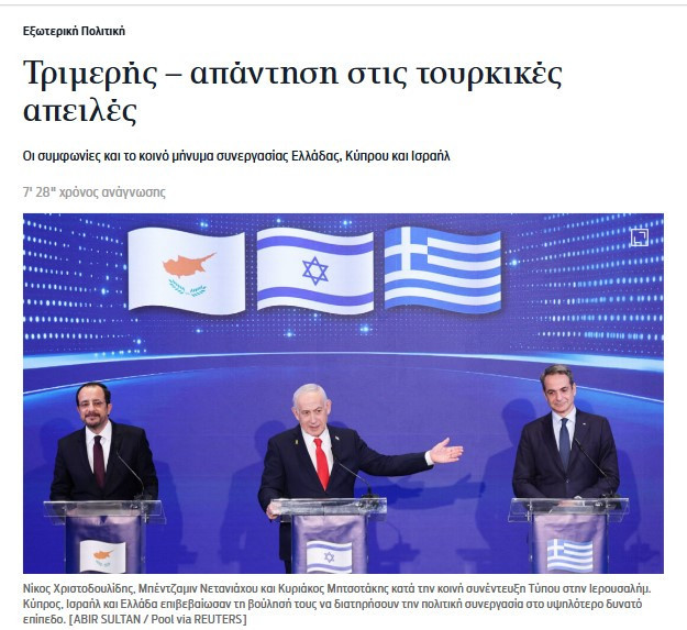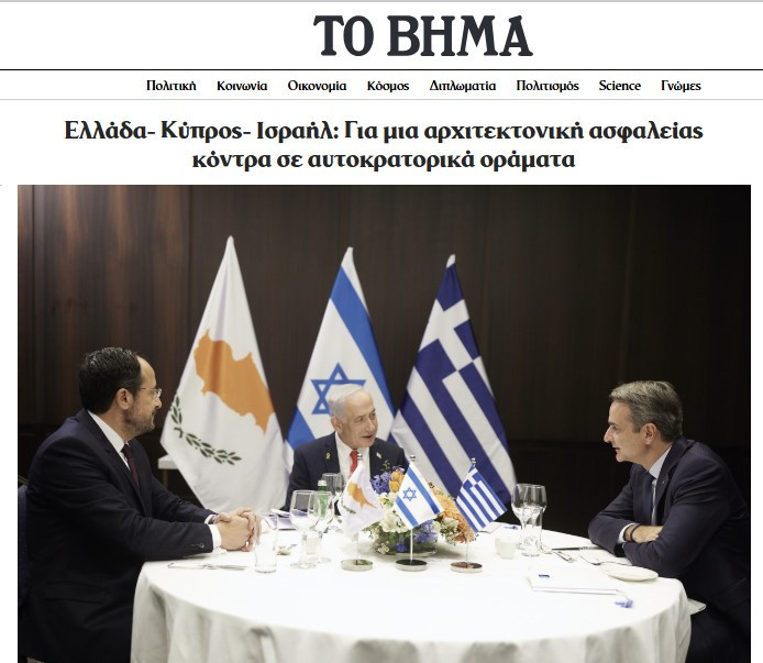 'Batı ile Doğu arasındaki kritik bir kavşakta, Orta Doğu haritasının yeniden çizildiği ve ABD’nin kesin rolünün hala belirsizliğini koruduğu bir geçiş döneminde, Yunanistan-Kıbrıs-İsrail üçlü iş birliği, güvenlik ve istikrarı garanti eden bir yapı olarak Kudüs’ten Miçotakis, Hristodulidis ve Netanyahu tarafından öne çıkarıldı.