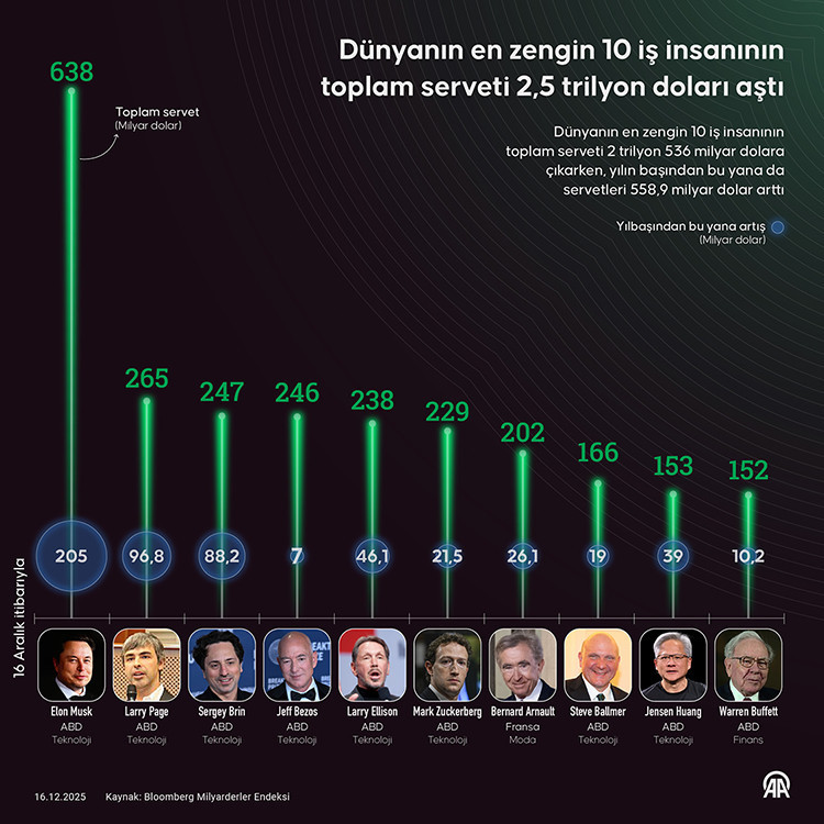 Dünyanın en zengin iş insanı 638 milyar dolarla Tesla'nın sahibi Elon Musk olurken, dünyanın en zengin 10 iş insanının serveti 2,5 trilyon doları aştı. AA muhabirinin, Bloomberg Milyarderler Endeksi verilerinden derlediği bilgilere göre, 16 Aralık itibarıyla dünyanın en zengin 10 iş insanının toplam serveti 2 trilyon 536 milyar dolara çıkarken, yılın başından bu yana dünyanın en zengin 10 kişisinin serveti 558,9 milyar dolar arttı. Dünyanın en zengin 10 iş insanından 9'u ABD, 1'i ise Fransa menşeli iken, 10 iş insanından 8'inin teknoloji sektöründe faaliyet gösterdiği görüldü.