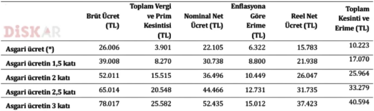 DİSK-AR tarafından sadece SGK kapsamındaki işçileri (yaklaşık 17 milyon) kapsayarak yapılan araştırmaya göre bir yandan enflasyon öte yandan artan gelir vergisi yükü nedeniyle harcanabilir gerçek (reel) ücretler büyük bir erozyonla karşı karşıya.