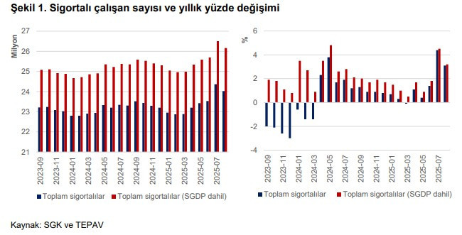 TEPAV tarafından SGK sigortalı çalışan verileri temel alınarak hazırlanan İstihdam İzleme Bülteni’nin Ağustos 2025 sayısı yayımlandı. Buna göre, Sosyal Güvenlik Destek Primi ödenen çalışanlar dahil toplam sigortalı çalışan sayısı yıllık bazda yüzde 3,2 arttı, ancak aylık olarak yüzde 1,3 gerileyerek 26 milyon 158 bin 64 seviyesinde gerçekleşti. Böylece mart ayından bu yana devam eden aylık yükseliş eğilimi ağustos itibarıyla son bulmuş oldu.