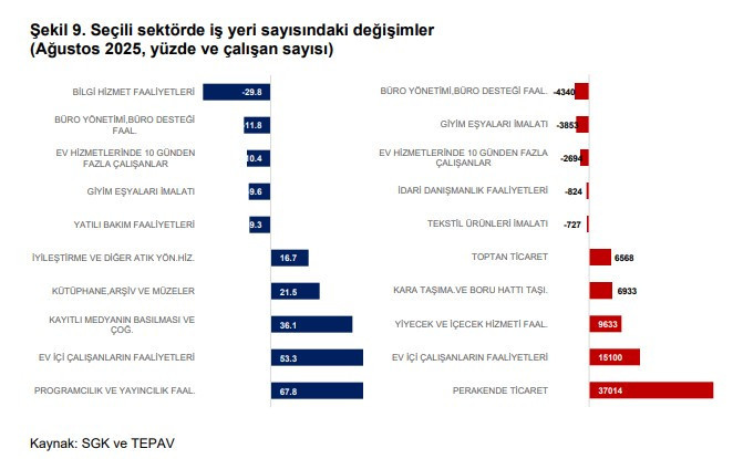 Ağustos 2025 itibarıyla yıllık bazda en yüksek istihdam artışı 140 bin 401 kişi ile bina inşaatı sektöründe gerçekleşti. Bu sektörü 130 bin 147 kişilik artışla perakende ticaret takip etti. Ayrıca yiyecek ve içecek hizmeti faaliyetleri (69 bin 219) ile insan sağlığı hizmetleri (53 bin 35) en çok istihdam artışı görülen diğer sektörler oldu.