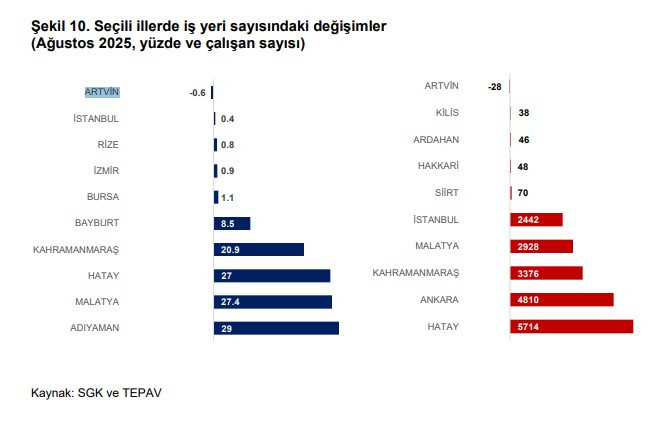 Toplam iş yerlerinin yarısı İstanbul (%27), Ankara (%7,4), İzmir (%6,7), Antalya (%4,5) ve Bursa (%4,2) olmak üzere beş büyük ilde yoğunlaşırken ağustos ayında iş yeri sayısının en fazla arttığı il 5 bin 714 artışla Hatay oldu. Hatay’ı sırasıyla Ankara (4 bin 810), Kahramanmaraş (3 bin 376) ve Malatya (2 bin 928) takip etti.