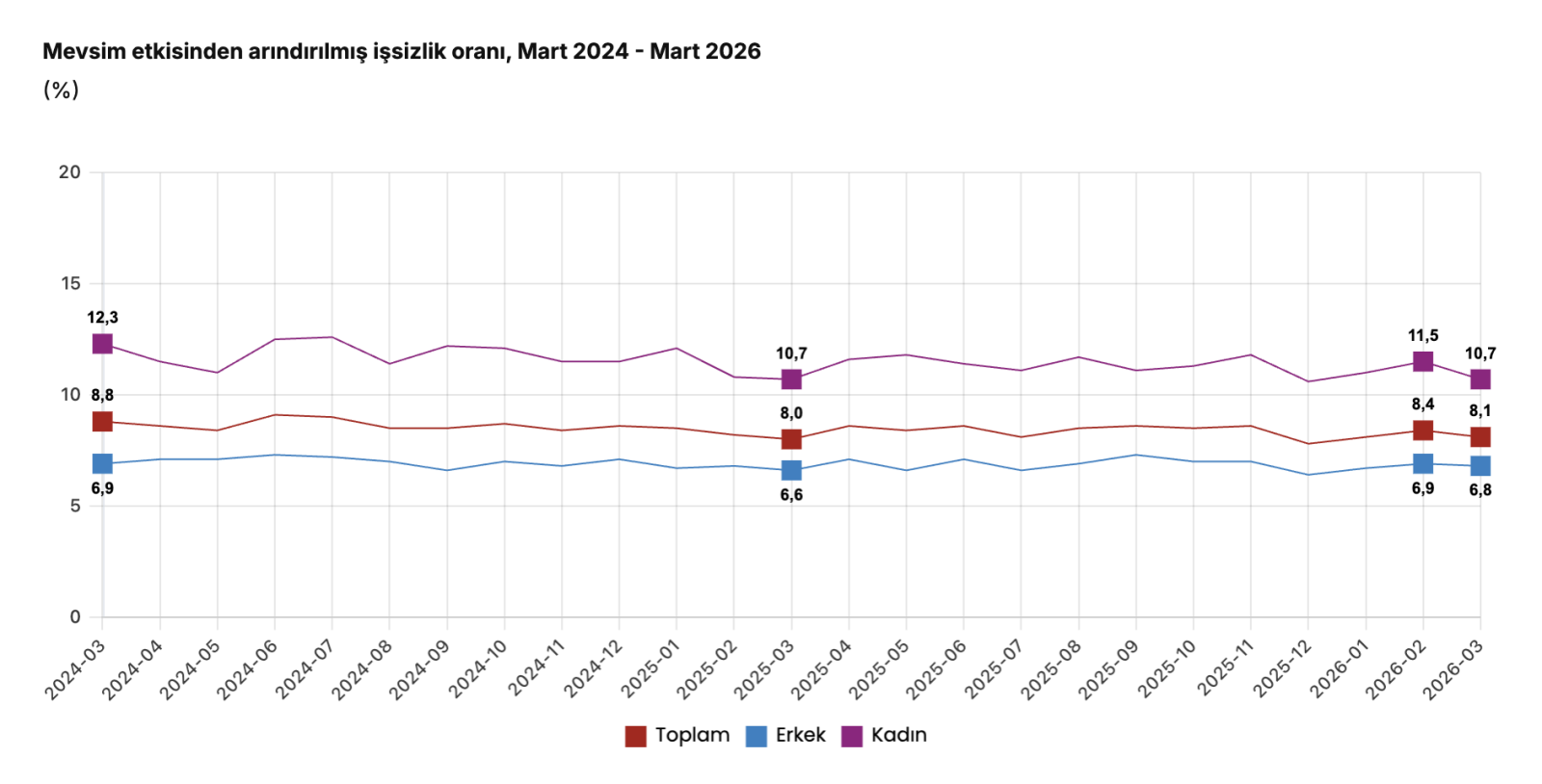 Mevsim etkisinden arındırılmış işsizlik oranı ise 0,3 puan düşüşle yüzde 8,1 seviyesinde gerçekleşti. İşsizlik oranı erkeklerde yüzde 6,8, kadınlarda yüzde 10,7 olarak tahmin edildi.
