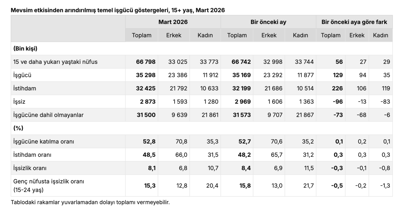 Türkiye İstatistik Kurumu (TÜİK), Mart 2026 dönemine ilişkin işgücü istatistiklerini açıkladı. Hanehalkı İşgücü Araştırması sonuçlarına göre, 15 ve daha yukarı yaştaki kişilerde işsiz sayısı mart ayında bir önceki aya göre 96 bin kişi azalarak 2 milyon 873 bin kişi oldu.