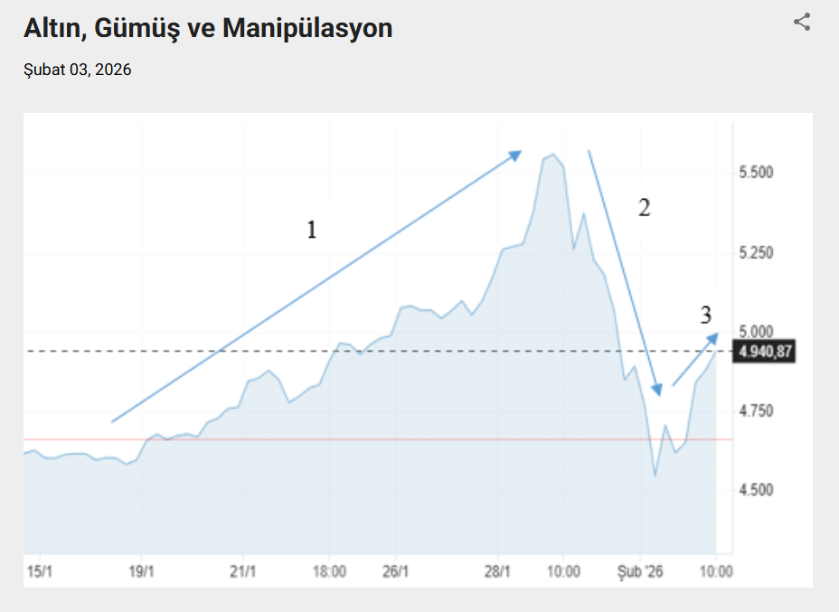 Altın fiyatının (USD/Ons) son 20 gündeki gelişimini gösteren grafik (03.02.2026 saat 12.30) aslında her şeyin özeti gibi. Önce Trump’ın yarattığı risklere İran meselesi de eklenince panik halinde altına hücum yaşanıyor (1 ile gösterilen bölge) ve yaklaşık iki haftada altın ons fiyatı 4.500 dolardan 5.500 dolara fırlıyor. Sonra burada bir anormallik olduğunun farkında olanlar sanki yaratılan bütün risklerin şahin yaklaşımlı bilinen Kevin Warsh’ın Fed Başkanlığı için aday gösterilmesiyle çözüldüğü bahanesiyle kâr realizasyonuna gidiyorlar. Bu kez panik satışlar başlıyor ve altın fiyatı hızla düşüşe geçiyor.