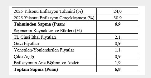 Varsayımlardaki bu sapmaların da etkisiyle 2025 yılsonu enflasyon tahmininden 6,9 puanlık bir sapma meydana gelmiş:
