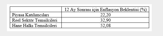 Bu yeni enflasyon tahminine yakın bir düzeyde enflasyon gerçekleşmesi açısından en önemli faktörlerden birisi enflasyon beklentilerin kırılıp kırılamayacağı meselesidir. TCMB’nin piyasa katılımcıları, reel sektör temsilcileri ve hane halkı temsilcilerine uyguladığı anketler yüzde 18’lik bir beklentiyi onaylamıyor. Örneğin 12 ay sonrası için çeşitli kesimlerin enflasyon beklentileri şöyledir: