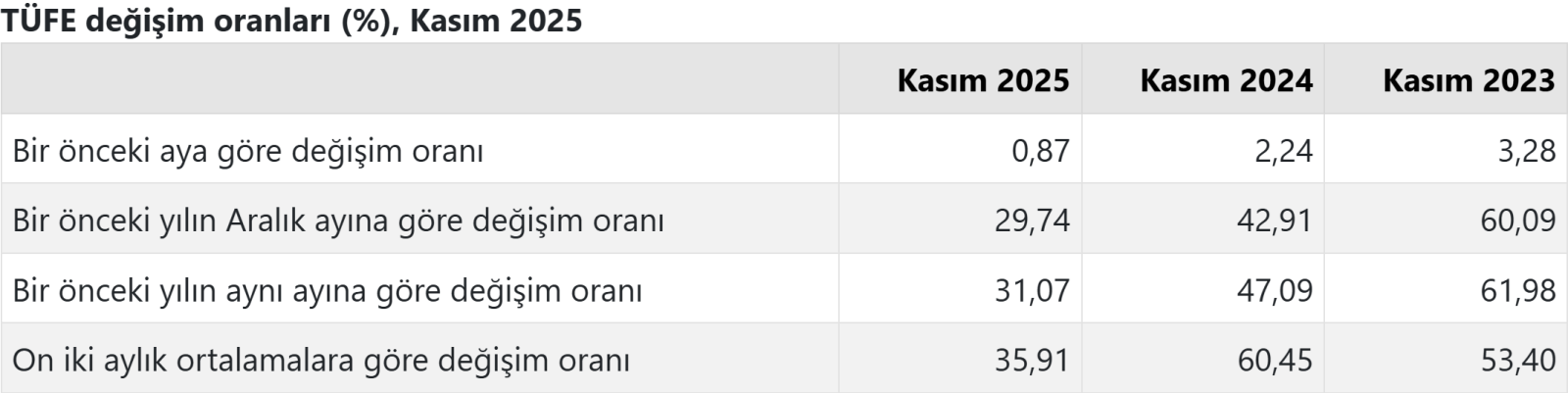 TÜİK tarafından açıklanan verilere göre, TÜFE 2025 yılı Kasım ayında bir önceki aya göre %0,87 artış, bir önceki yılın Aralık ayına göre %29,74 artış, bir önceki yılın aynı ayına göre %31,07 artış ve on iki aylık ortalamalara göre %35,91 artış olarak gerçekleşti.