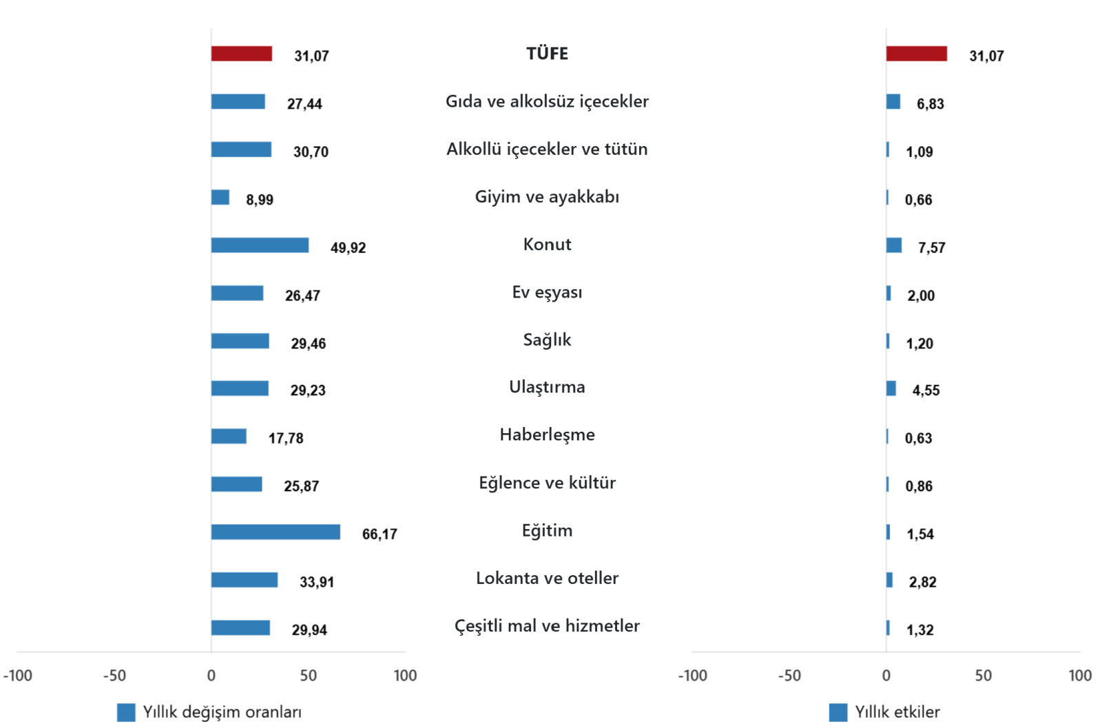 En yüksek ağırlığa sahip 3 ana harcama grubunun yıllık değişimleri; gıda ve alkolsüz içeceklerde %27,44 artış, ulaştırmada %29,23 artış ve konutta %49,92 artış olarak gerçekleşti. İlgili ana grupların yıllık değişime olan etkileri ise gıda ve alkolsüz içeceklerde %6,83, ulaştırmada %4,55 ve konutta %7,57 oldu.