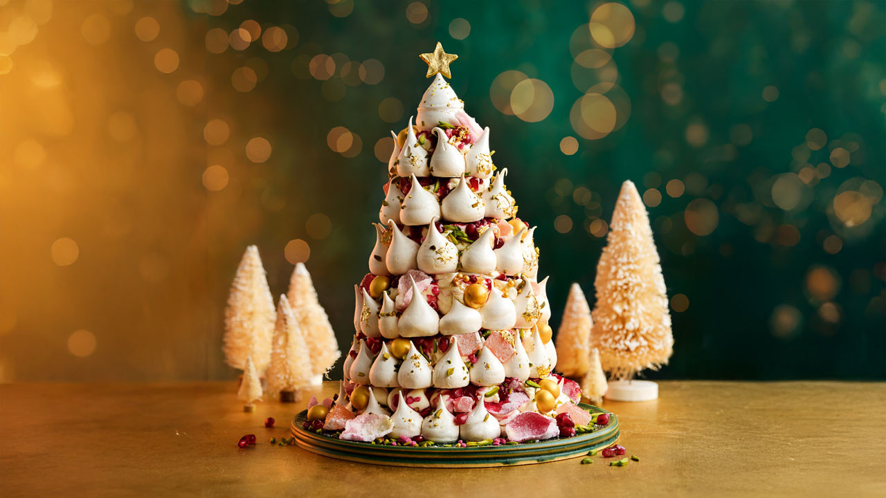- Dolguyu hazırlamak için kremayı, mascarpone peynirini, pudra şekerini ve gül suyunu büyük bir kâsede yumuşak tepecikler oluşana kadar çırpın. En büyük beze diskini bir kek standına veya servis tabağına yerleştirin. Üzerine dikkatlice biraz kremalı karışımdan sürün, kaşıkla biraz meyve sosu gezdirin. Sonra biraz fıstık, nar tanesi ve birkaç parça lokum serpiştirin. Ağaç şekli elde edene kadar aynı işlemi, her seferinde bir küçük beze diski kullanarak tekrarlayın. En üste tekli bezenizi yerleştirin. Son olarak, altın kaplı çikolata drajeler, gül yaprakları, şekerlemeler ve altın yaprakla (kullanıyorsanız) süsleyin. En tepesine altın renkli yıldızı yerleştirin ve servis edin. Hazırlandıktan sonra bir saat içinde tüketilmesi idealdir ancak artanları iki güne kadar buzdolabında saklayabilirsiniz.