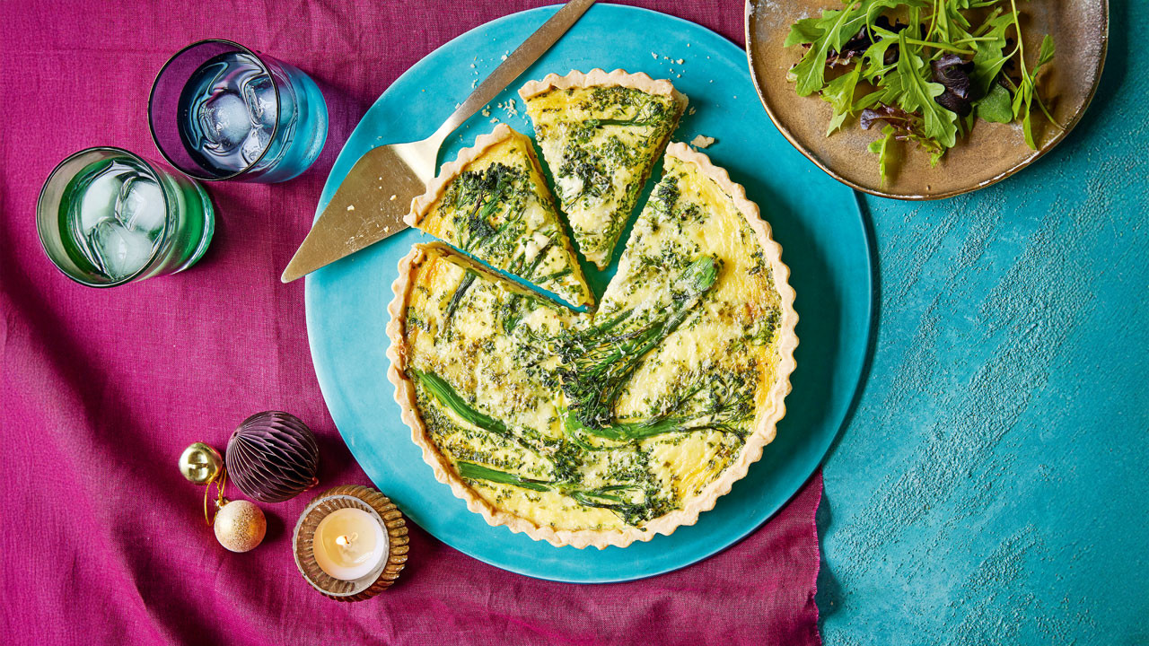 - Yumurtaları, kremayı, hardalı ve ince doğranmış otları bir kapta karıştırın, tuz ve karabiberle lezzetlendirin. Fırın sıcaklığını 160°C’ye düşürün. Karamelize soğanı eşit şekilde üzerine yayın. Peynirin 100 gramını 1 cm’lik küçük küpler halinde kesin ve üzerine serpiştirin. Brokolileri düzenli şekilde yerleştirdikten sonra yumurta karışımını üzerine dökün. Kalan peyniri rendeleyip serpin. 35–40 dakika kadar, iç harcı tam olarak pişip kıvam alana kadar pişirin. Kişi kalıbında 30 dakika kadar soğumaya bırakın, ardından dilimleyip servis edin.