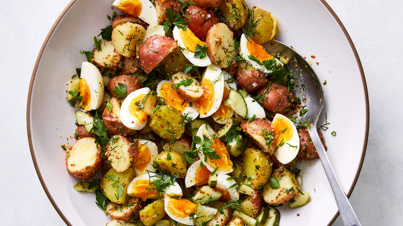 - Yumurtaları ikiye ya da dörde bölün. Servis yaparken patates salatasının üzerine yerleştirin, yumurtaları tuz ve karabiberle tatlandırın, biraz da zeytinyağı gezdirin. (Bu patates salatası buzdolabında 3 güne kadar saklanabilir.)