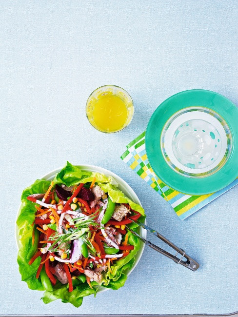 Kırmızı, sarı, mor, yeşil renkleriyle bu canlı salata neredeyse gökkuşağının tüm renklerini barındırıyor. Nişastalı olmayan, düşük glisemik indeksli sebzeler ve bezelye ile tatlı mısırın dengesi sayesinde yoğun bir öğleden sonrası için enerji kaynağı olacak.