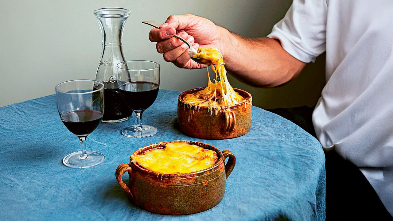 Bu çorbayı ilk kez tattığım günü asla unutmam: Küçük bir çocukken, Alpler’e ilk kayak seyahatimde ailemle öğle yemeği için mola vermiştik. Önüme buharı tüten, soğan, peynir ve ekmek dolu bir tencere gelmişti. Annem dikkatli olmamı, çorbanın çok sıcak olduğunu söyledi ama o kokuya karşı koyamadım ve dilimi yaktım. O günden beri neredeyse her seferinde aynı şeyi yapıyorum. Tüm Fransız restoranlarının baş tacı olan bu tarif, aslında sadece soğan, bayat ekmek ve suyla yapılan mütevazı bir köylü yemeği olarak ortaya çıkmış. Günümüz versiyonu biraz daha süslü olsa da evde yapması oldukça basit. Yavaşça karamelize edilmiş soğanlar, derin ve lezzetli bir et suyuna karışır, baget dilimleri bu aromayı emer ve üzeri bolca erimiş gravyer peyniriyle kaplanır. Yiyen herkese kendini iyi hissettiren bir lezzettir...