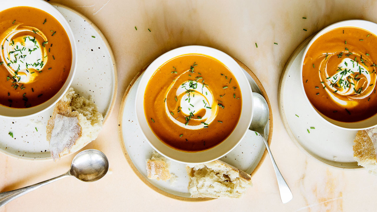 - Biraz soğuduğunda blender ile pürüzsüz bir kıvam elde edene kadar karıştırın. Dört kaseye paylaştırın, üzerine biraz ekşi krema ekleyin ve frenk soğanı serpin. Kızarmış ekmekle servis edin.