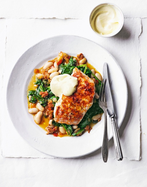 - Balıkları beş dakika veya gevrekleşene kadar ızgara yapın ama kurutmayın. Fasulye karışımını tabaklara paylaştırın, üzerine balıkları ve tepside kalan suyu dikkatlice dökün. İsterseniz bir kaşık sarımsaklı mayonez ile servis edin.