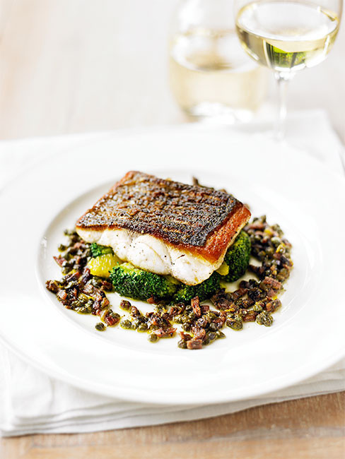 - Son iki yemek kaşığı yağı tavaya dökün ve tekrar yüksek ateşte ısıtın. Kapari ile ançüezleri ekleyin ve gevrekleşene kadar kızartın. Limon kabuğu rendesi ve limon suyunu ekleyin, balığın ve brokolinin üzerine serpiştirin ve servis yapın.