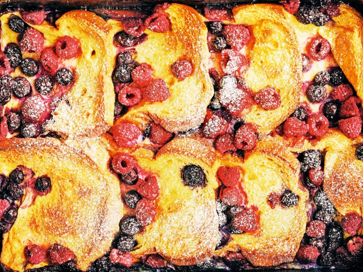 - Brioche dilimlerini yumurta karışımına batırın, iyice ıslanana kadar çevirin, ardından 25 x 40 cm’lik bir fırın tepsisine veya tavaya, dilimler tek kat olacak şekilde ancak hafifçe üst üste gelecek şekilde yerleştirin. Kalan yumurta karışımını dilimlerin üzerine dökün. Her brioche diliminin altına birkaç yaban mersini ve ahududu yerleştirin, geri kalanını dilimlerin üzerine serpiştirin. Üzerini kapatın ve en az bir saat buzdolabında dinlendirin. Ertesi sabah kahvaltıda pişirmek isterseniz bir gece buzdolabında bekletebilirsiniz.