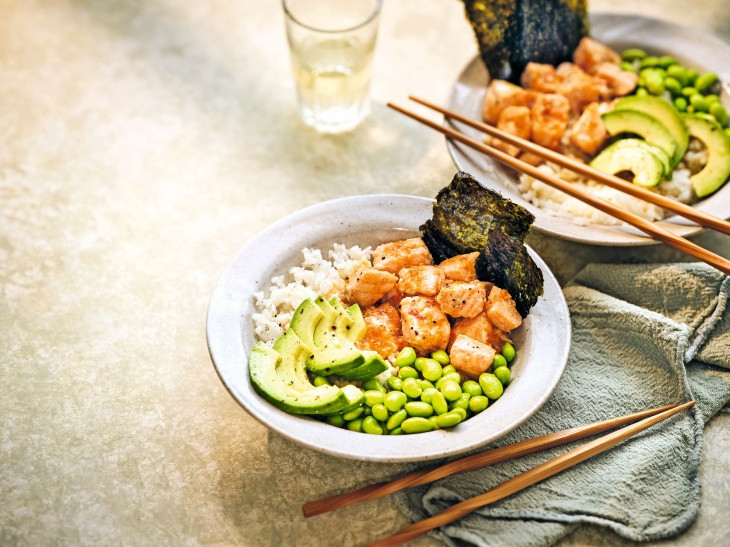 - Somon neredeyse piştiğinde, pirinci paket talimatlarına göre ısıtın. İki kâseye paylaştırın, üzerine avokado, edamame ve pişmiş somonu yerleştirin. Fırın tepsisinde kalan marine sosunu somonun üzerine sürün ve çıtır nori yapraklarıyla servis edin.