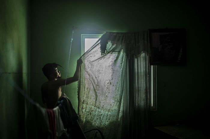 Victor Griffiths, Jamaika’yı vuran Melissa Kasırgası’ndan üç gün sonra, çamurla kaplanan Montego Bay’deki odasında perdesini tamir ediyor. 31 Ekim 2025