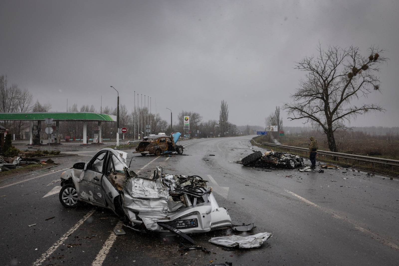 Buça'nın batısını giden yolda, pazar günü ölü bir adam sırt üstü yatıyordu. Yeşil bisikleti yanına devrilmişti. Yüzünden vurulan adamın kafatasında büyük bir delik vardı. Polis, Dmitrivka Köyü'nün yakınındaki çam ormanına uzanan yolun ilerisinde, günün erken saatlerinde yüzü ve üniforması yanmış bir Rus askerin cesedini vurulmuş bir tanktan çıkardı. Belgeleri 22 yaşında olduğunu ve Sibirya’nın güneyi Buryatya’dan geldiğini gösteriyordu. Yok edilen tanklar, öğleden sonra geç saatlerde Kiev’deki kar fırtınası ile kaplandı.