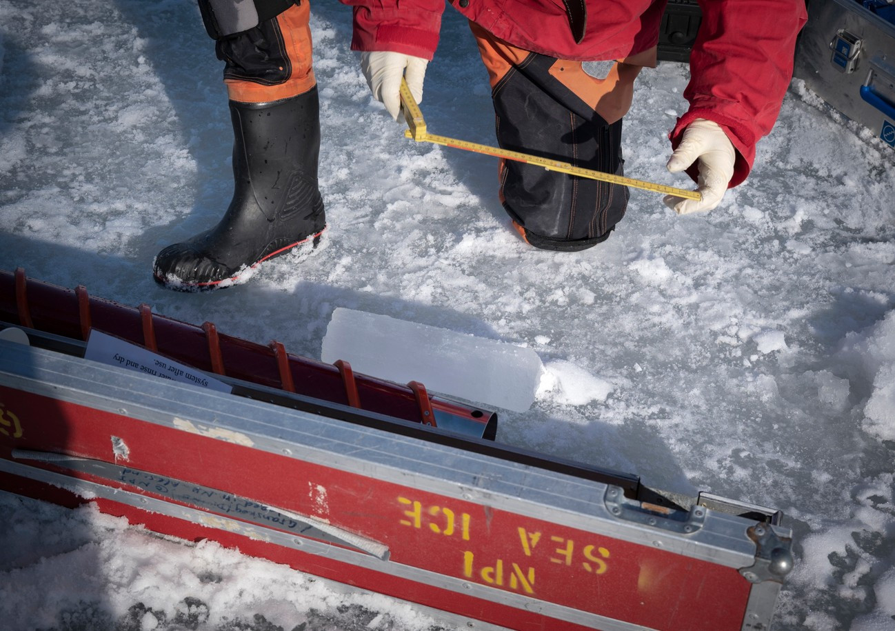 Bilim insanları her bahar aynı fiyordun buz tabakasına sondaj yapıyor, kalınlık, sıcaklık ve tuzluluk ölçümleri için silindir biçiminde örnekler alıyor.