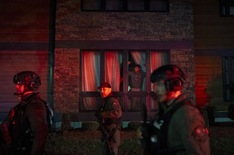 Bir apartman sakini, 13 Aralık 2025 Cumartesi gecesi Rhode Island eyaletinin Providence kentinde Brown Üniversitesi yakınlarındaki bir sokakta devriye gezen polisleri izliyor.