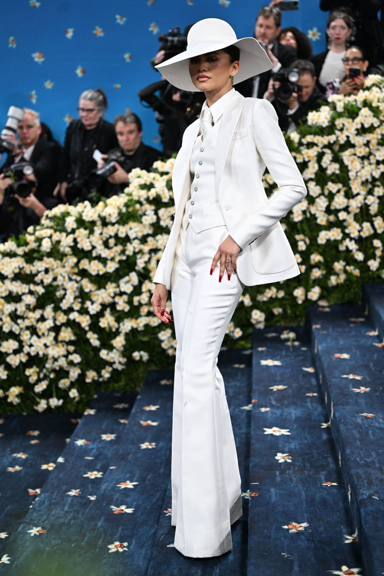 MET Gala etkinliğinin yıllardır en şık isimlerinden biri olan Zendaya, Pharrell Williams imzalı özel bir Louis Vuitton tasarımı giydi. Beyaz takım elbise, Black dandyism kültürünün önemli parçalarından biri olan zoot takımlarının köklü tarihine özel bir gönderme taşıyor.