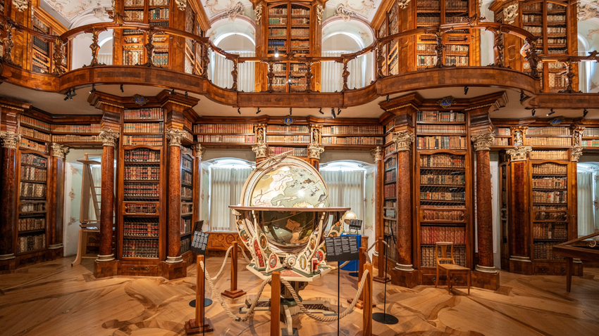 Doğu İsviçre'de konuşlanan Aziz Gall Manastır Kütüphanesi, ince işçilikli ahşapları, balkonlu iskeleleri ve deri ciltli kitaplardan oluşan geniş koleksiyonuyla dünyanın en iyi korunmuş Barok kütüphanelerinden biri. Yüzyıllar boyunca İsviçre'nin en büyük ve en eski manastır kütüphanesi, Avrupa'nın entelektüel hazinelerinden biri olarak kabul edilen yerler arasında. Gösterişli bir tavan freski dikkat çekiyor. Yeryüzü ve gökyüzü küreleri, Mısır mumyaları ve nadire dolapları (cabinet of curiosities) ile çevrili bir salonu var.