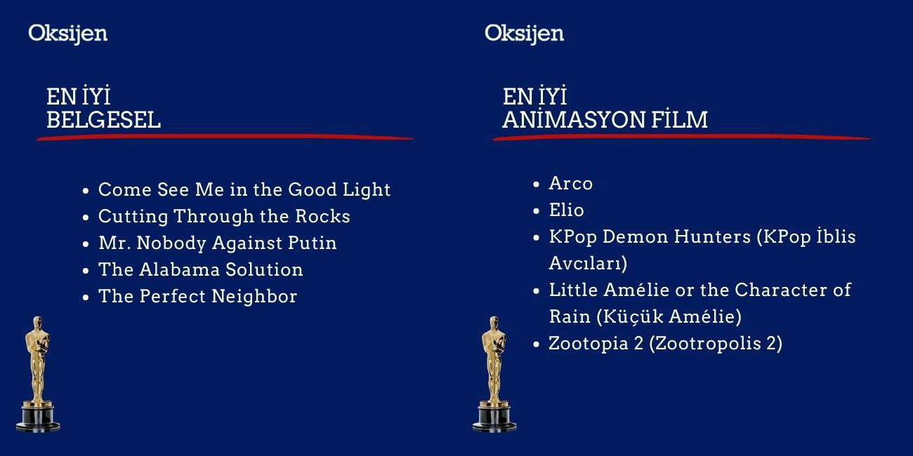 Animasyon kategorisinin en güçlü favorisi Netflix’in sürpriz hiti “Kpop İblis Avcıları”. İkinci favori ise gişe şampiyonu “Zootopia 2”. Belgesel kategorisinde de bir Netflix filmi favori. İnsanın içini yakan bir suç hikayesi anlatan “The Perfect Neighbor”.